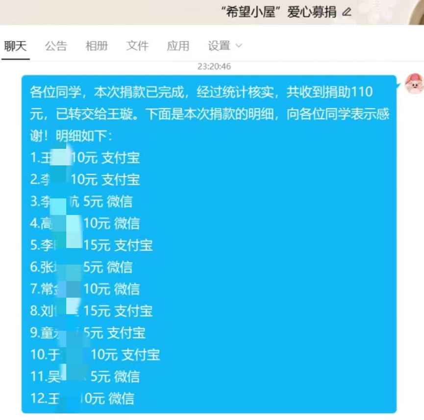 自项目发起以来,十大买球官网紧跟步伐,近年来大力建设“希望小屋”,并定期举行募捐活动,以加强“希望小屋”的建设力度。此次捐款活动采取线上方式进行,通过QQ群等发出倡议,进行广泛宣传动员,广大师生积极参与。