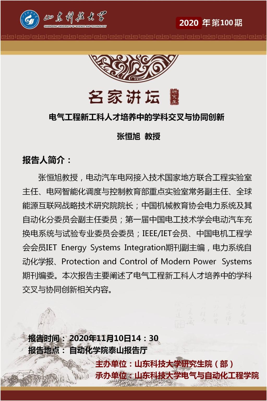 十大买球官方网站承办第100期“名家讲坛”:张恒旭教授