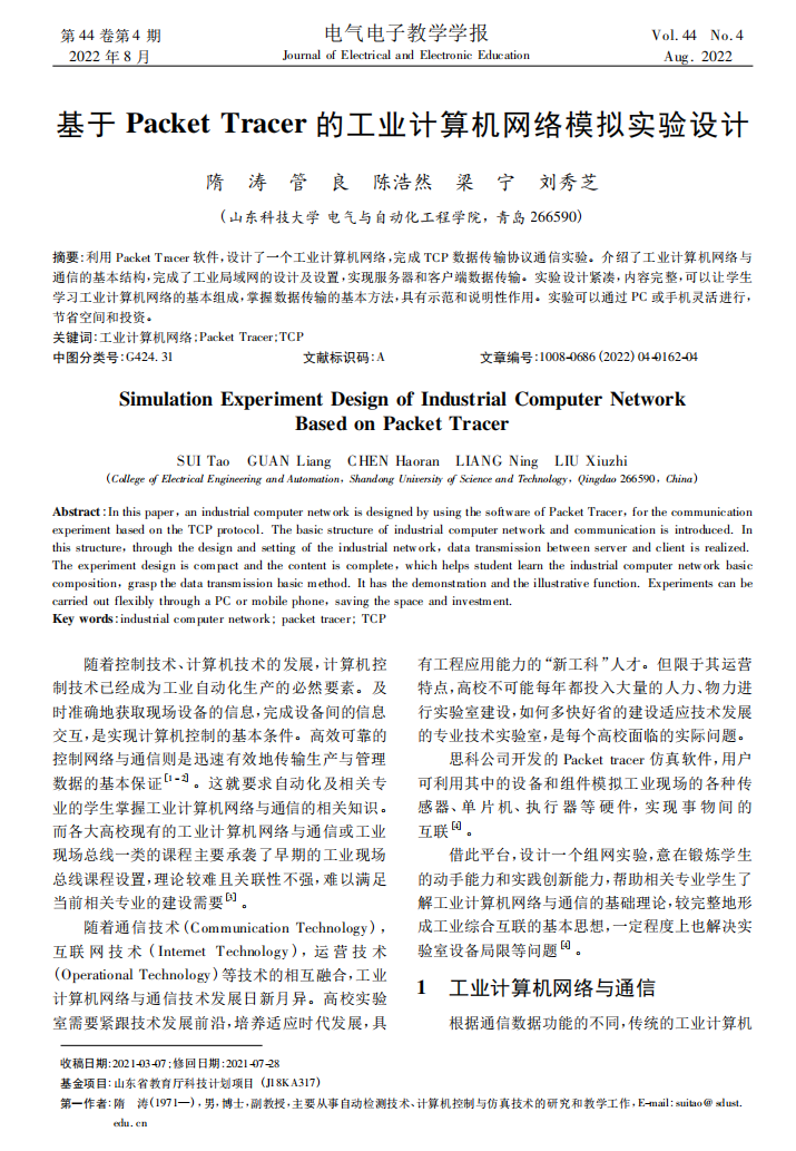 20 基于Packet Tracer的工业计算机网络模拟实验设计